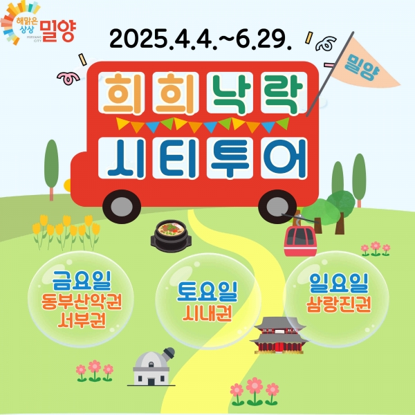 [아시아월드뉴스] 밀양시는 다음달 4일부터 6월 29일 매주 금요일부터 일요일까지 ‘희희낙락 밀양 시티투어'를 운영한다고 24일 밝혔다.