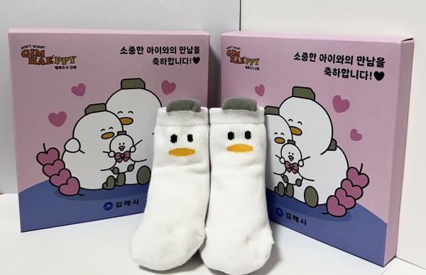 축하선물은 김해시 고유 캐릭터인 토더기 문양을 새긴 아기 양말로 아기 피부에 무해한 순면 소재로 직조해 미끄럼방지 가공처리를 해 만들었다.