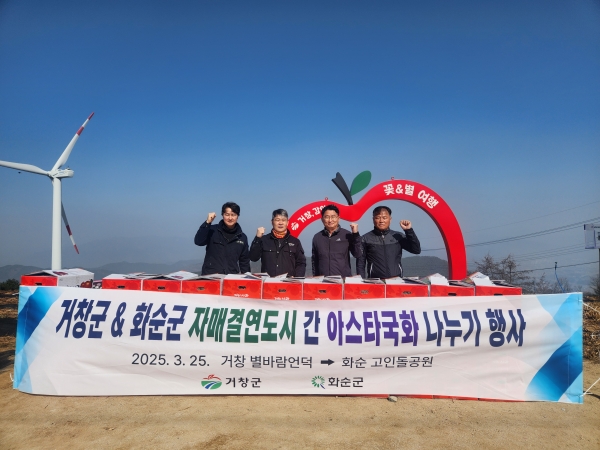 거창군과 화순군은 인구와 산업 여건, 행정력이 유사해 2023년 자매결연을 맺은 이후 지속적인 교류를 이어오고 있으며 이번 아스타국화 나눔을 계기로 문화·관광 분야에서 협력을 더욱 강화했다.