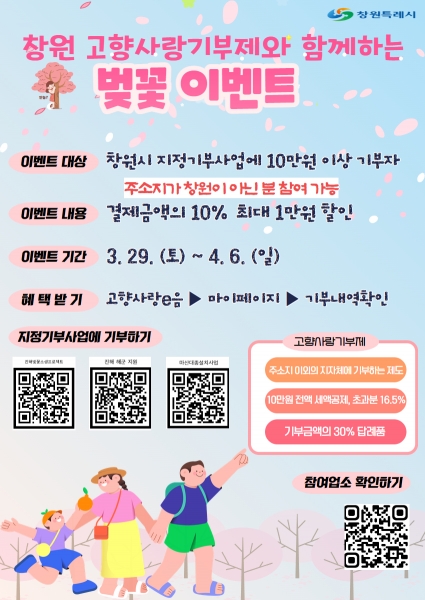 특히 벚꽃갈비로 대표되는 창원의 맛집 ‘성산명가’에서는 창원시 고향사랑기부제 지정기부사업 중 ‘벚꽃 소생 프로젝트’ 기부자에 한 해 10% 할인을 제공하기로 했다.