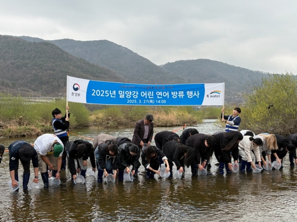 [아시아월드뉴스] 환경부와 K-water는 지역대학생들과 함께 27일 낙동강 지류 하천인 밀양강에 어린 연어 30만 마리를 방류했다.