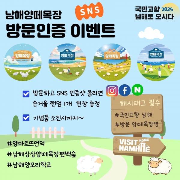 남해군 내 양떼목장을 방문해 SNS 인증샷을 업로드하고 해시태그 #국민고향 남해, #방문 양떼목장명을 입력하면 현장에서 확인 후, 양떼목장 한정판 손거울을 증정한다.