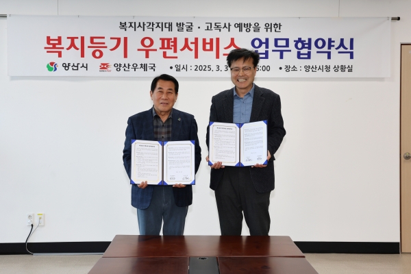 [아시아월드뉴스] 양산시는 31일 양산우체국과 복지사각지대 발굴, 고독사 예방을 위한 ‘복지등기 우편사업’ 추진 업무협약을 체결했다고 밝혔다.