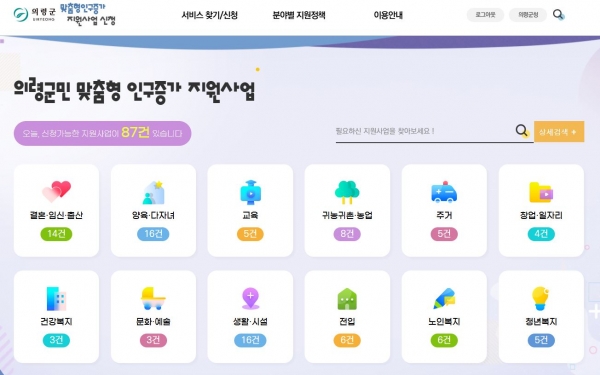 [아시아월드뉴스] 의령군이 이달 1일부터 ‘결혼·육아·주거’ 등 핵심 인구정책을 통합 제공하는 온라인 서비스를 운영한다.