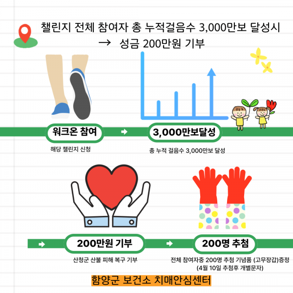 [아시아월드뉴스] 함양군보건소 치매안심센터는 오는 4월 3일부터 9일까지 7일간 ‘비대면 워크온 치매극복 희망의 착한 걸음’ 이라는 이름으로 비대면 걷기 기부 챌린지를 운영한다.