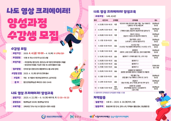 [아시아월드뉴스] 함안군은 평생학습 분야 영상활동가를 양성하는 ‘나도 영상 크리에이터’ 양성과정 수강생을 오는 4일 오전 10시부터 10일까지 선착순으로 모집한다.