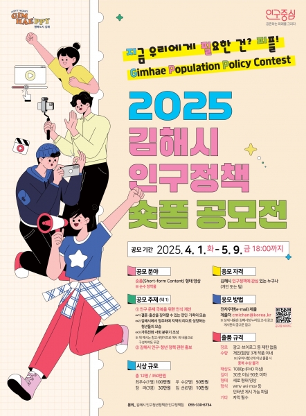 [아시아월드뉴스] 김해시는 시의 인구정책과 인구 위기에 관심을 유도하기 위해 ‘인구정책 숏폼 공모전’을 개최한다고 2일 밝혔다.