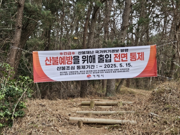 이에 거제시는 지난 29일부터 관내 전체 임야, 등산로 임도를 긴급 폐쇄하고 가용 감시인력을 총동원해 산불방지에 총력을 기울이고 있다.