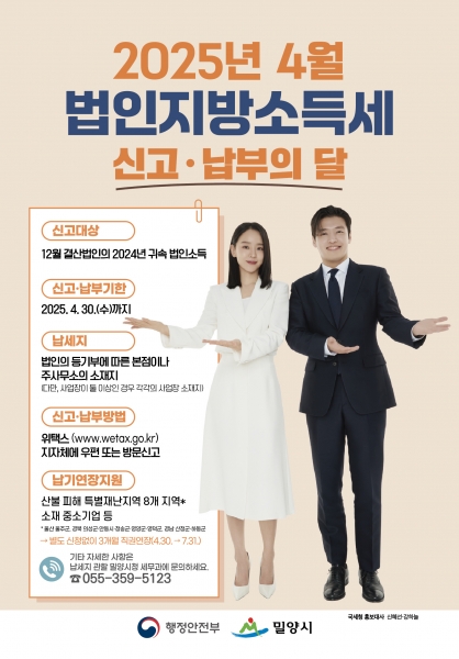 [아시아월드뉴스] 밀양시는 2024년 귀속 사업연도에 대한 법인지방소득세를 오는 30일까지 신고·납부해야 한다고 7일 밝혔다.