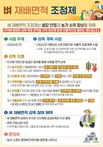 군은 벼 재배면적 조정제에 참여한 농가에 대해 경영안정자금 및 공공비축미 우선 배정 등 다양한 인센티브를 제공하며 참여를 적극 독려하고 있다.