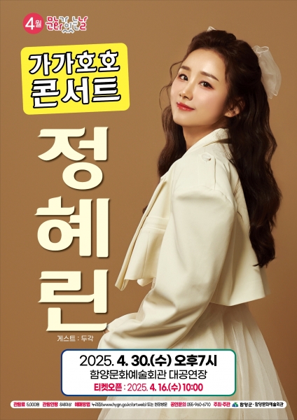 [아시아월드뉴스] 함양문화예술회관은 ‘문화가 있는날’ 4월 행사로 오는 4월 30일 오후 7시 함양군문화예술회관 대공연장에서 ‘정혜린 가가호호 콘서트’를 공연을 개최한다고 밝혔다.