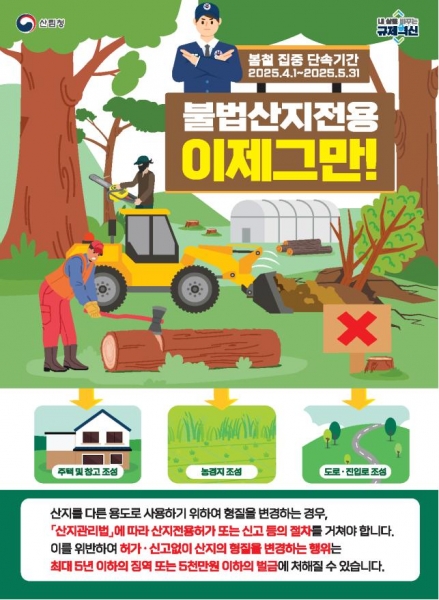이번 단속은 △임산물 불법 굴·채취 △무허가 벌채 및 불법 형질 변경 행위 △산림 또는 인접 지역 내 불법 소각 △입산통제구역 무단 입산 등을 중점 대상으로 하며 군은 현장 중심의 단속 강화를 위해 단속반을 편성해 운영할 계획이다.