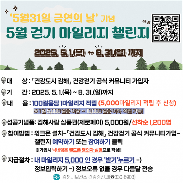김해시는 걷기 마일리지 챌린지 참여자들에게 100걸음 당 1마일리지를 지급하고 5,000마일리지 적립을 달성하면 선착순 1,200명에게 김해사랑상품권 5,000원을 지급한다.