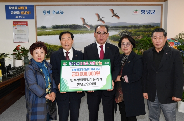 [아시아월드뉴스] 창녕군은 지난 10일 민주평화통일자문회의 창녕군협의회가 산불 진화 과정에서 안타깝게 순직한 희생자들의 유가족을 돕기 위해 성금 300만원을 기탁했다고 밝혔다.
