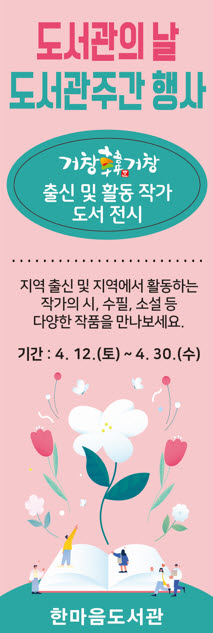 전시는 4월 12부터 30일까지 한마음도서관 2층 로비에서 진행되며 거창 출신 대표 작가인 신길자, 신용목 작가를 포함해 30여명 작가의 간단한 약력 소개와 시, 수필, 소설, 웹툰 등 다양한 분야의 도서 80여 권이 전시된다.