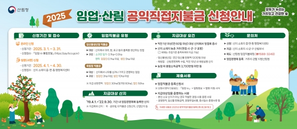 지난달 온라인 신청을 하지 않은 지급 대상 임업인은 반드시 이달 30일까지 산지 소재지 담당 읍면사무소를 방문해 등록신청서를 제출해야 한다.