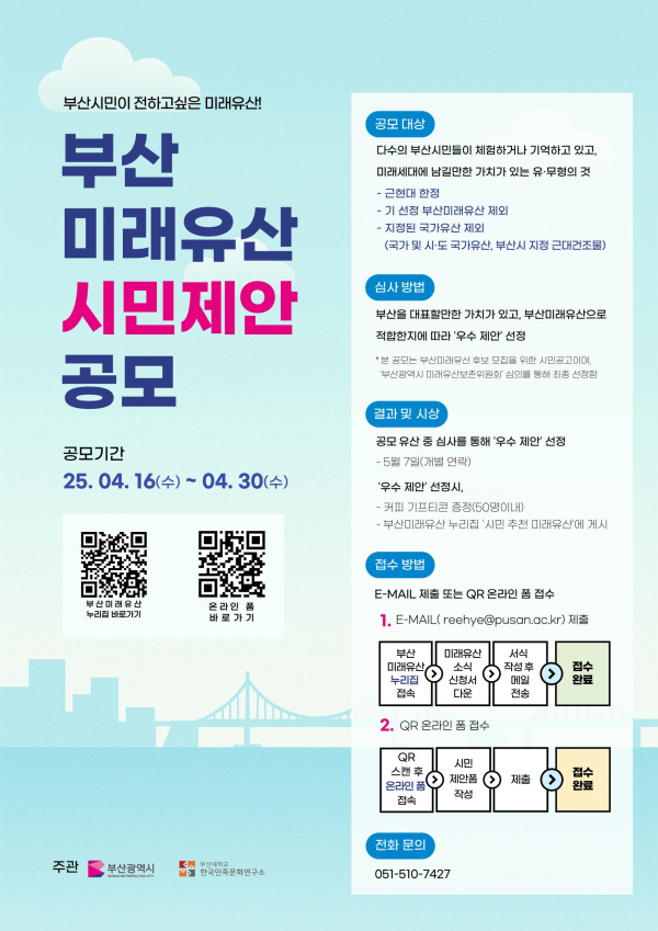 공모 최종 결과는 오는 5월 7일 발표될 예정이며 기타 자세한 사항은 부산미래유산 누리집 내 미래유산 소식 또는 시 문화유산과 유산활용등재팀으로 문의하면 된다.