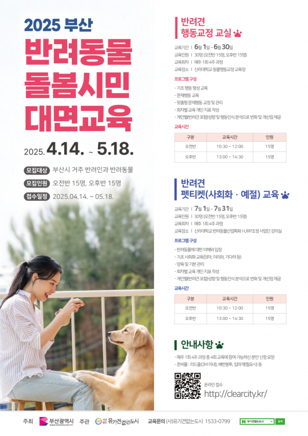 [아시아월드뉴스] 부산시는 반려동물 친화 도시 부산을 조성하기 위한 '2025 부산 반려동물 돌봄 시민교육'을 운영하며 오는 5월 18일까지 상반기 교육 참가자를 모집한다고 밝혔다.