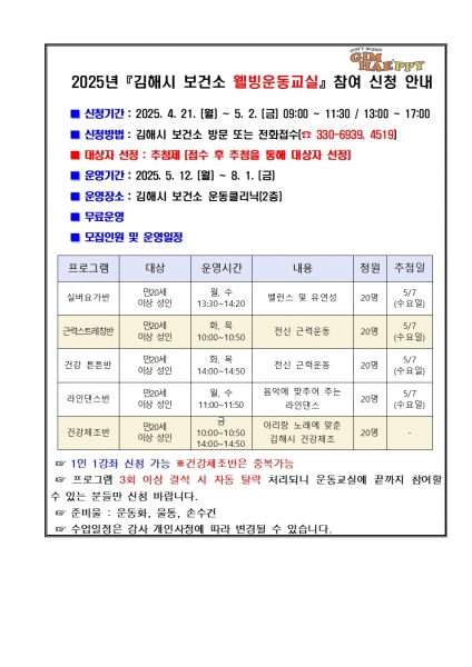 [아시아월드뉴스] 김해시보건소는 오는 21일부터 5월 2일까지 2025년 제2기 웰빙운동교실 참가자를 모집한다고 밝혔다.