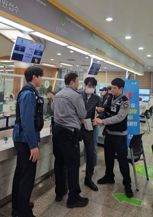모의훈련은 행복민원실 직원, 청원경찰, 경찰관 등이 합동으로 민원인 응대 과정에서 발생할 수 있는 폭언·폭행 등 위법행위로부터 민원담당 공무원을 보호하는 대처 능력 향상을 위해 마련됐다.