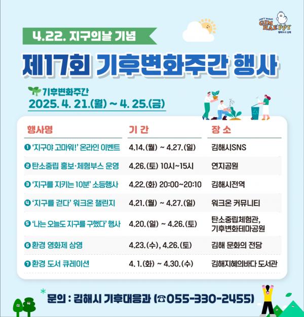 [아시아월드뉴스] 김해시는 제55주년 지구의 날을 맞아 오는 21일부터 27일까지 ‘해보자고 기후행동 가보자고 적응생활’ 이라는 슬로건으로 제17회 기후변화주간을 운영한다고 17일 밝혔다.