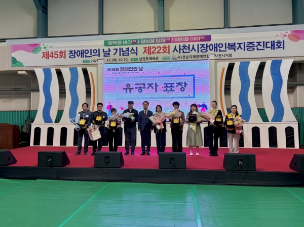 이번 행사는 ‘행복을 바라봄, 일상을 담아봄, 희망을 이어봄’을 슬로건으로 경남지체장애인협회 사천시지회가 주최했으며 사천시 장애인단체의 2024년 활동 영상 상영, 관내 장애인복지기관의 고고장구와 댄스 공연을 시작으로 장애인 인권 헌장 낭독, 유공자 표창, 대회사, 격려사, 축 사천시는 17일 장애인과 장애인 가족, 장애인단체, 기관 관계자 등 1,000여명이 참석한 가운데 ‘제45회 장애인의 날 기념식 및 제22회 사천시장애인복지증진대회’를 성황리에 개최했다.