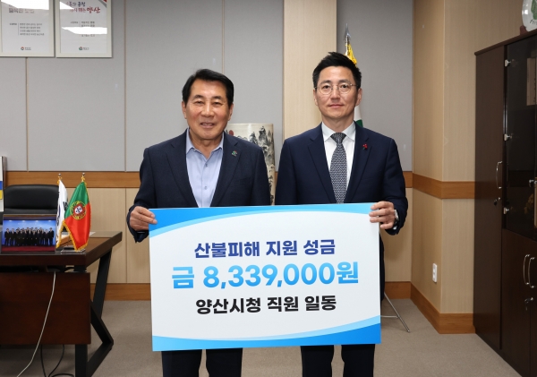 [아시아월드뉴스] 양산시는 17일 오후 시장 집무실에서 산불 피해 주민들을 돕기 위한 모금성금 8,339,000원을 경남사회복지공동모금회에 전달했다.