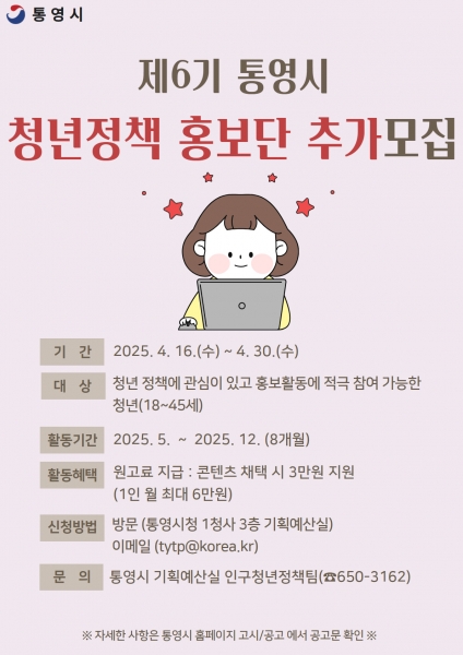추가 모집인원은 7명이며 선정된 홍보단은 개인 SNS를 통해 통영시의 청년정책, 관련 사업, 행사 등을 소개하는 콘텐츠를 게시하게 된다.