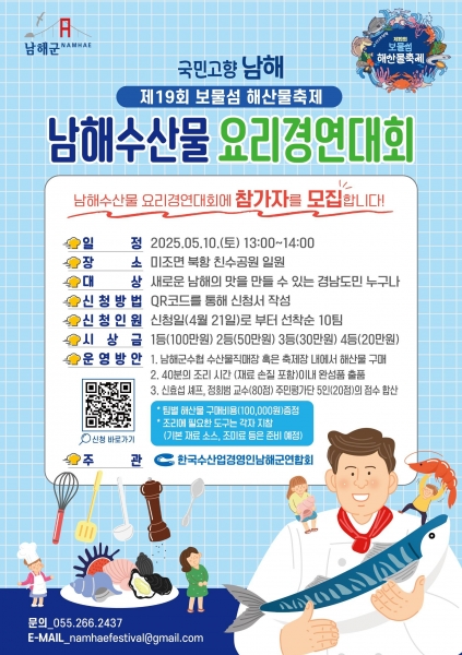한편 청소년 경연대회와 남해 수산물 요리 경연대회는 오는 4월 21일부터 선착순으로 참가자를 모집한다.