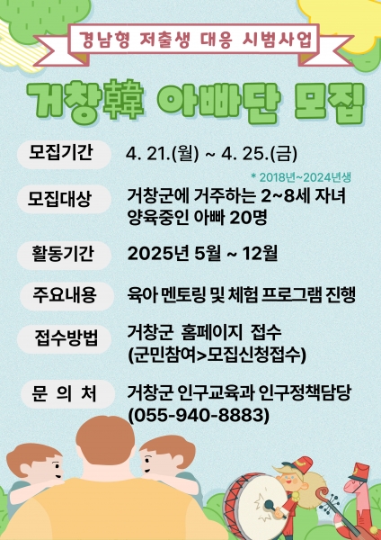 ‘거창한 아빠단’은 거창군에 거주하며 2세부터 8세까지의 자녀를 둔 아빠를 대상으로 하며 4월 21일부터 25일까지 5일간 거창군 홈페이지에서 신청할 수 있다.
