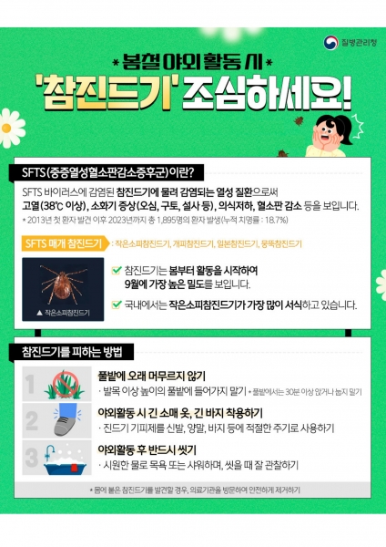 구인모 거창군수는 “봄철 야외활동이 늘어나면서 참진드기와의 접촉 위험도 커지고 있다”며 “예방수칙을 철저히 지키고 몸에 붙은 참진드기를 발견했을 경우에는 의료기관을 통해 안전하게 제거하고 적절한 조치를 받을 것을 당부드린다”고 말했다.
