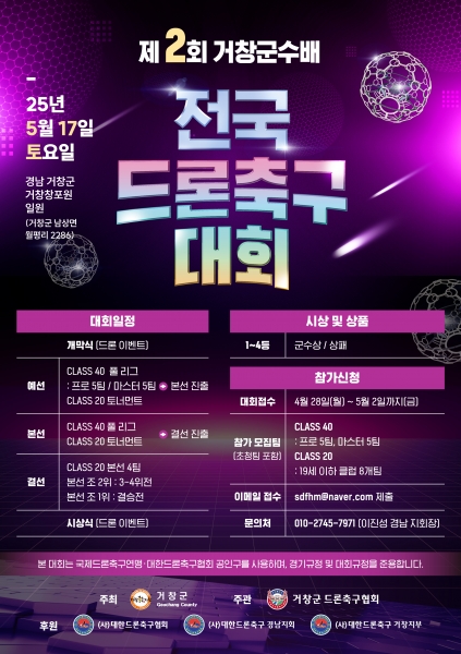 이번 대회는 거창의 대표 봄축제인 ‘거창에 On 봄축제’ 와 연계해, 축제 방문객들에게 다채로운 즐길거리를 제공할 예정이며 지난해 성공적으로 열린 ‘제1회 거창군수배 유소년 드론축구대회’의 경험을 바탕으로 규모를 한층 확대했다.