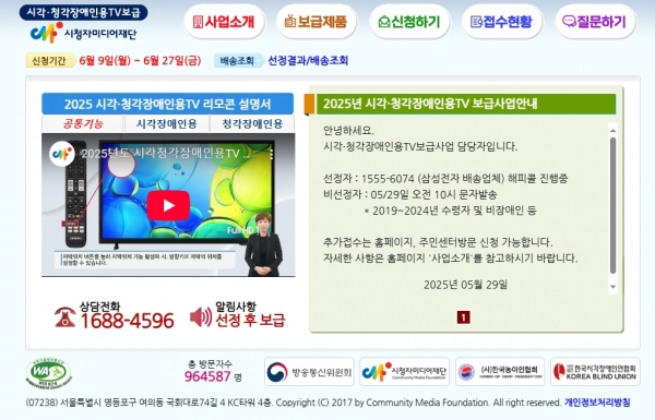 [아시아월드뉴스] 합천군은 시각·청각장애인의 방송접근권 보장을 위해 6월 9일부터 6월 27일까지 시각·청각장애인용 tv 보급사업 유상신청자를 모집한다.