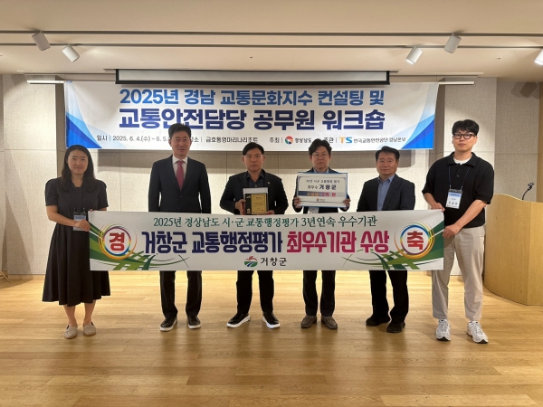 [아시아월드뉴스] 거창군은 경상남도 ‘2025년 시·군 교통행정평가’에서 최우수 시군으로 선정돼 지난 4일 경상남도 주관으로 열린 2025년 교통문화지수 컨설팅 및 교통안전담당 공무원 워크숍에서 기관표창과 특별조정교부금 2억원을 받았다고 밝혔다.
