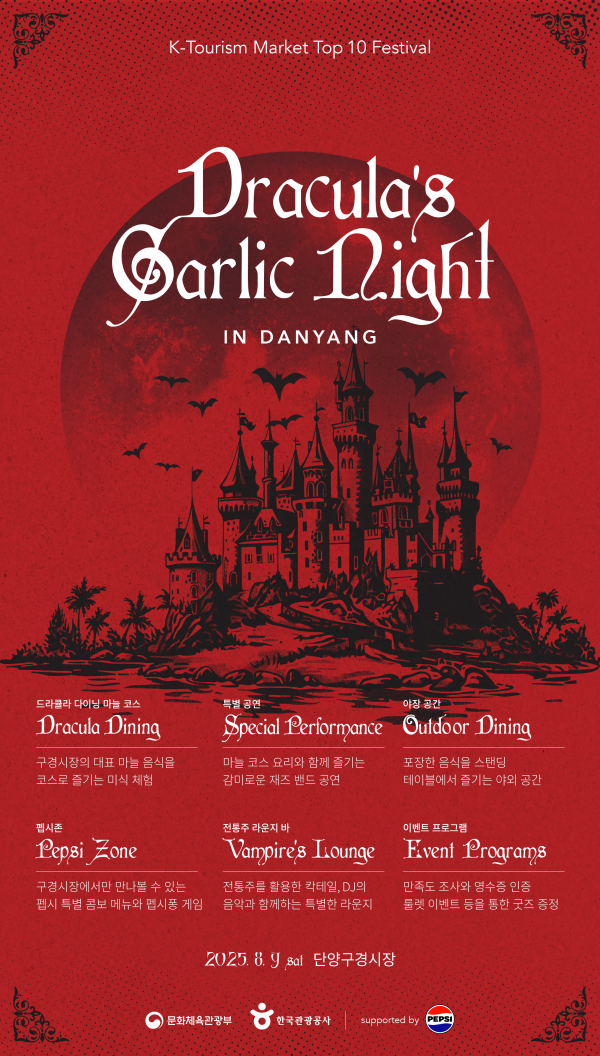 [아시아월드뉴스] 한국관광공사는 지난 9일 충북 단양의 ‘단양구경시장’에서 미식 축제 ‘드라큘라 갈릭 나이트’를 열고 이색 콘텐츠를 선보였다.