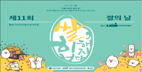 [아시아월드뉴스] 농림축산식품부는 오는 8월 18일 제11회 쌀의 날을 맞아 쌀의 우수성을 알리고 쌀 중심의 식습관 확산과 쌀 소비 활성화를 위해 8월 14일에 수원 국립농업박물관에서 기념행사를 진행한다.