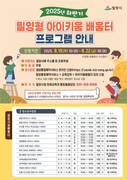 밀양시에 주소를 둔 아동이라면 누구나 무료로 참여할 수 있으며 신청은 오는 19일부터 22일까지 밀양통합예약서비스에서 온라인으로 가능하다.