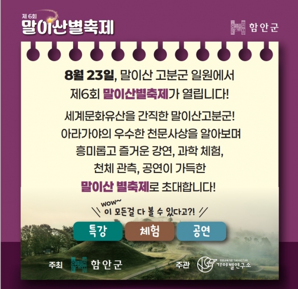 [아시아월드뉴스] 함안군은 오는 8월 23일 함안박물관 및 말이산고분군 일원에서 ‘제6회 말이산 별축제’를 개최한다고 밝혔다.