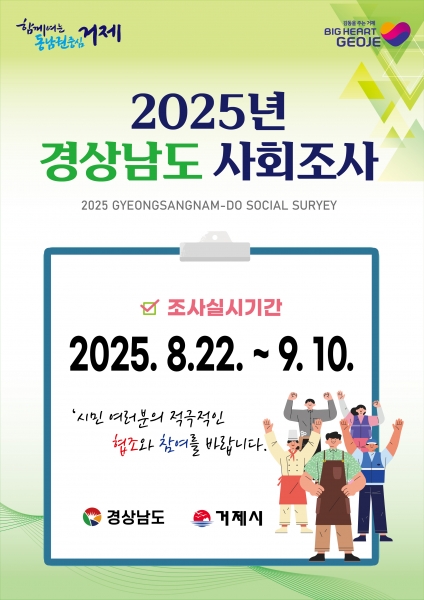 [아시아월드뉴스] 거제시는 8월 22일부터 9월 10일까지 관내 표본 800가구 만 15세 이상 가구원을 대상으로 2025년 경상남도 사회조사를 실시한다.