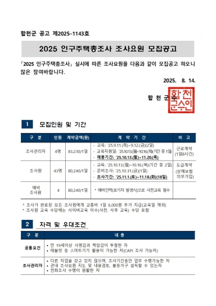 [아시아월드뉴스] 합천군은 통계청이 5년마다 전국적으로 실시하는 ‘2025년 인구주택총조사’의 성공적인 수행을 위해 8월18일부터 8월29일까지 현장 조사업무를 담당할 조사요원을 모집한다.