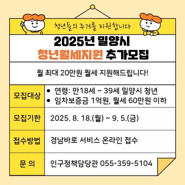 [아시아월드뉴스] 경남 밀양시는 오는 9월 5일까지 청년층의 주거비 부담 완화와 안정적인 정착 지원을 위한 ‘2025년 청년 월세 지원사업’ 대상자 15명을 추가 모집한다고 18일 밝혔다.