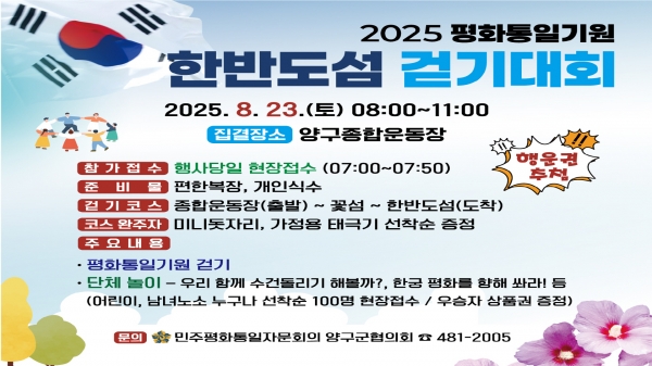 민주평화통일자문회의 양구군 협의회의 주관으로 열리는 이번 걷기대회는 군민이 함께 걸으며 평화와 통일의 염원을 나누고 광복 80주년의 의미를 되새기기 위한 취지로 마련됐다.