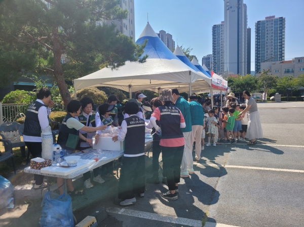 이날 통영시 여성민방위기동대에서는 과일화채를 얼음과 컵에 담아 실제훈련 참가인 150여명, 관람객 300여명에게 제공했다.