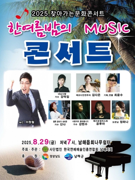 [아시아월드뉴스] 남해군은 오는 29일 오후 7시 남해읍 회나무쉼터에서 ‘2025년 찾아가는 문화콘서트 – 한여름 밤의 Music 콘서트’를 개최한다.