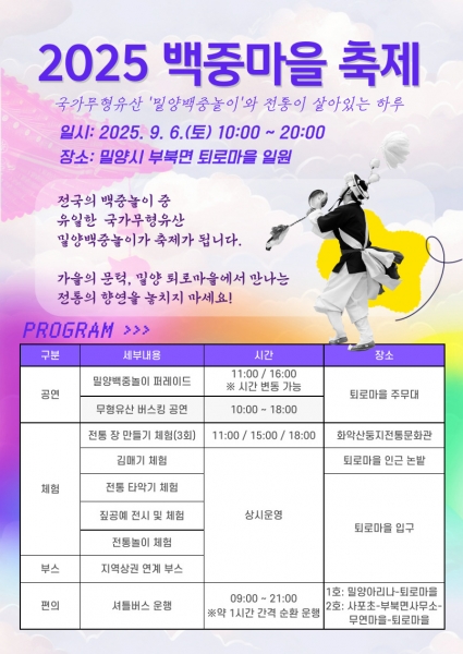 이번 축제는 밀양문화관광재단 주관으로 열리며 밀양백중놀이를 시민과 관광객이 함께 즐기고 계승하는 장으로 마련됐다.
