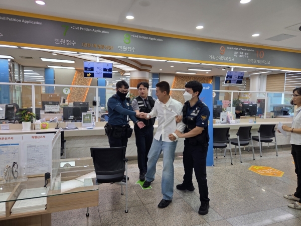 참가자들은 △상급자 등 적극 개입 △비상벨 작동과 청원경찰 호출 △피해공무원 보호 △방문 민원인 대피 △가해민원인 진정 △경찰 인계 등 단계별 시나리오에 맞춰 대응했다.