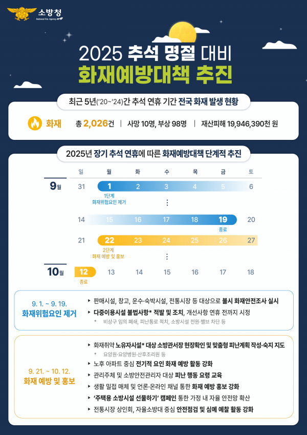 [아시아월드뉴스] 소방청은 오는 9월 1일부터 10월 12일까지 약 6주간 ‘추석 명절 대비 화재예방대책’을 집중 추진한다고 26일 밝혔다.