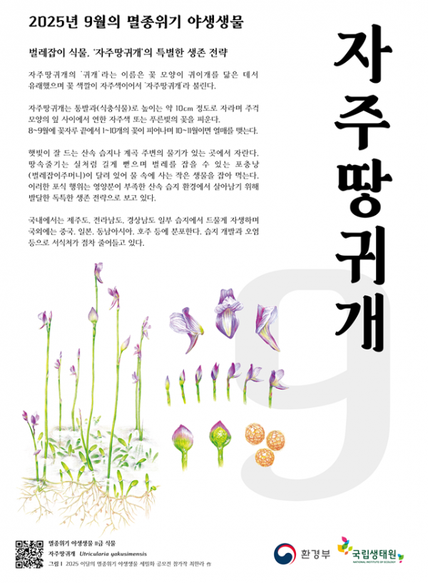 [아시아월드뉴스] 환경부는 9월 ‘이달의 멸종위기 야생생물’로 산속 습지에서 자라는 식충 식물인 ‘자주땅귀개’를 선정했다고 밝혔다.