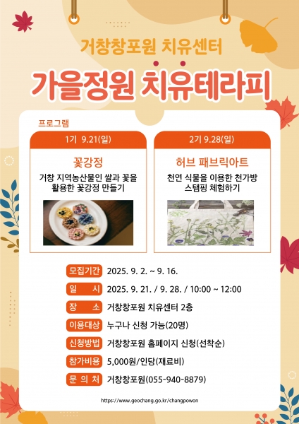 [아시아월드뉴스] 거창군은 거창창포원 내 치유센터에서 9월 한 달 동안 20여명을 대상으로 지역 농산물과 자연 재료를 활용한 ‘가을정원 치유테라피 프로그램’을 운영한다고 밝혔다.