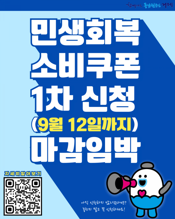 [아시아월드뉴스] 거제시는 ‘민생회복 소비쿠폰’ 1차 신청이 오는 9월 12일 마감됨에 따라, 아직 소비쿠폰을 수령하지 않은 시민들에게 신청을 서둘러 줄 것을 당부했다.
